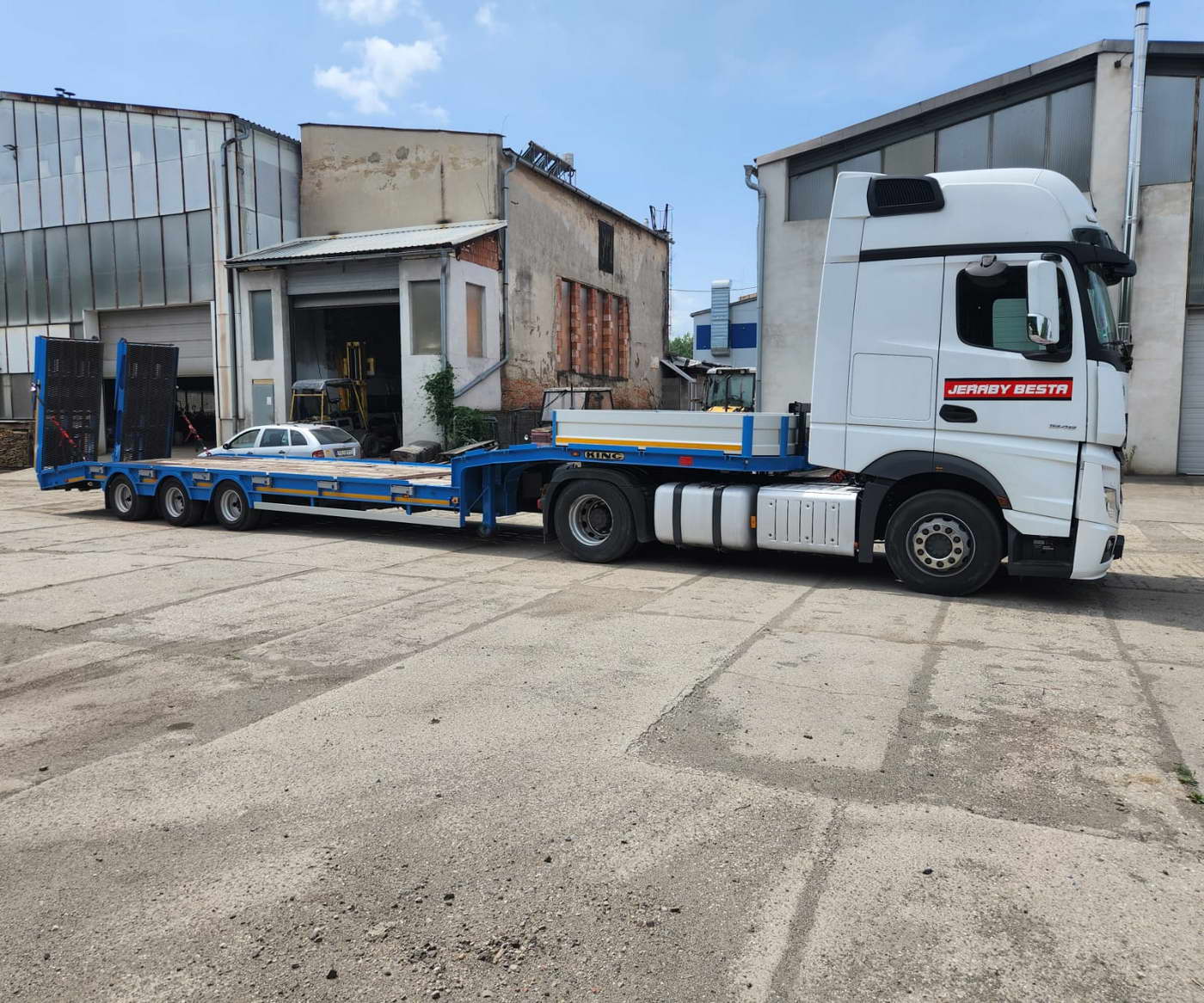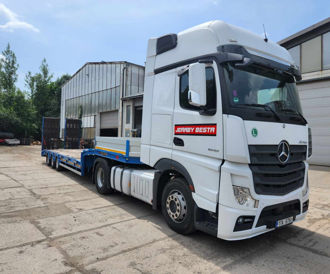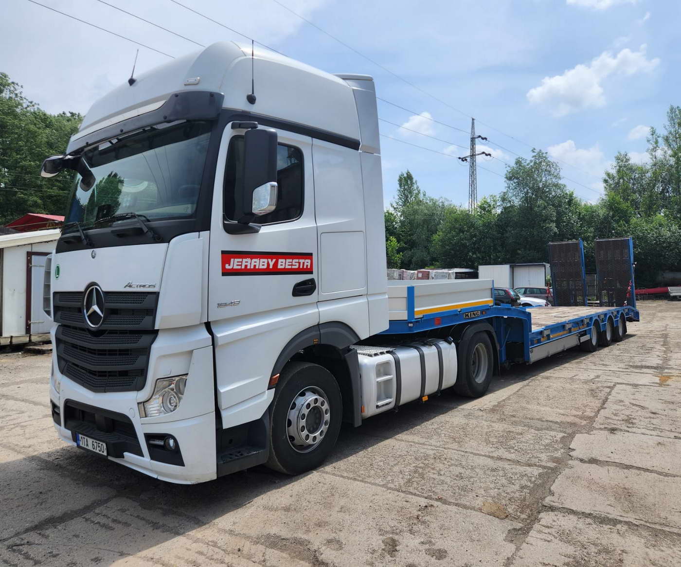 Tahač s návěsem slouží na přepravu strojů a nákladů do hmotnosti 27 000 kg.